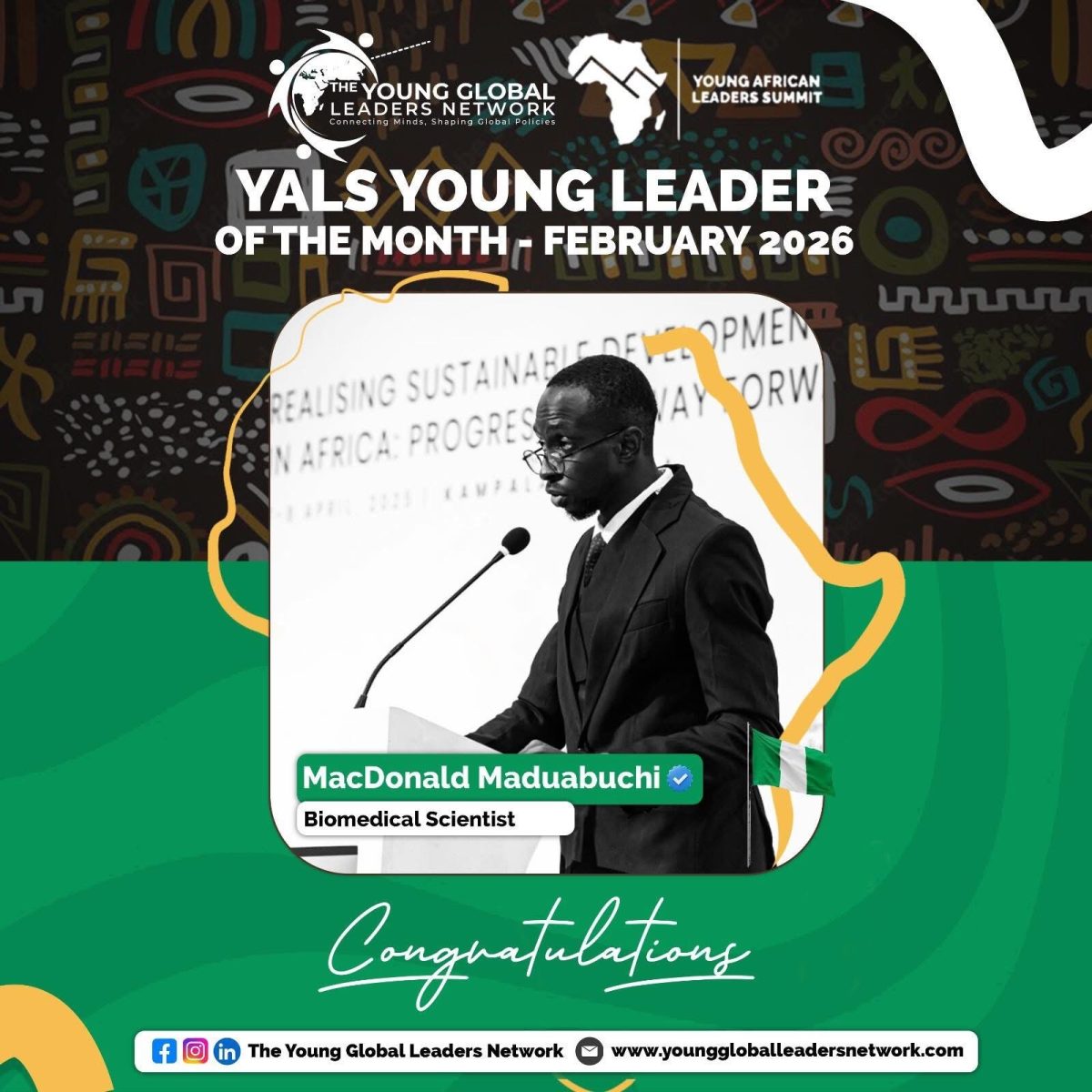 In February 2026, the Young African Leaders Summit, an initiative of Young Global Leaders Network proudly recognised MacDonald Maduabuchi of Nigeria as our YALS Young Leader of the Month.